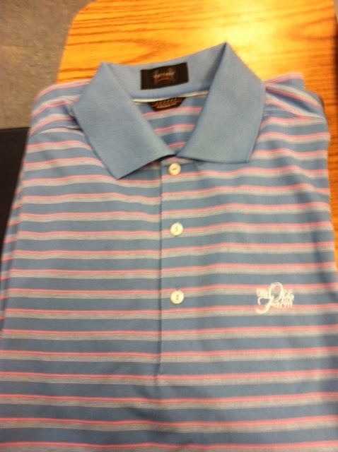 Men’s Eritage Size Medium Blue with White and Pink Horizontal Stripes Olde Farm Polo ($75 value)