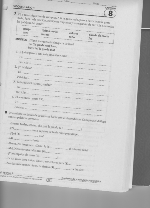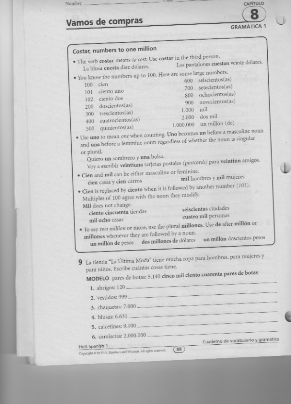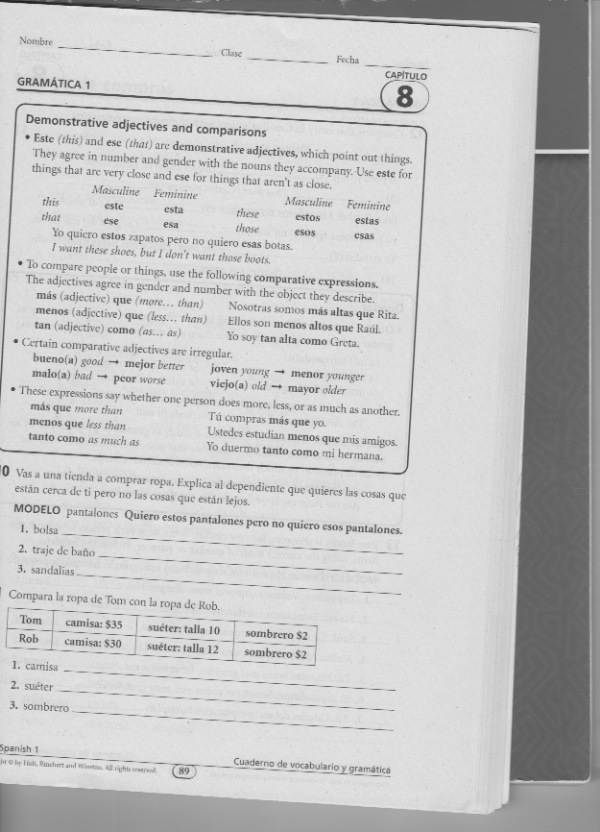 pag. !a= p. 85; p. 2B = p. 85; p.3C= p. 87; The page titled Numbers =p. 88 and the page titled 'Demostrativos' = p. 89. Spanish 1 - Final - Outline To prepare for you Final, do the Final Review Quiz and the Cultura (5-8). They are located at the bottom of My quizzes, activities, and survey section on this page. Remember you must score 70% to get credit.