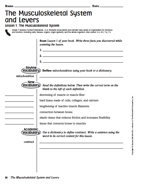 Today we will collect the Chapter 9, Lesson 1 outlines. We are assigning pages 88-91 in the Science Notebook workbook. These are due Wednesday. The students will be tested on Thursday. The test will cover Chapter 9, Lesson 1 Vocabulary (bone, cartilage, joint, tendon, relaxation, contraction), the 5 Functions of the skeletal system (1. protecting internal organs, 2. supporting the body, 3. providing attachment points to allow movement, 4. storing calcium, and 5. forming blood cells), and knowing the 6 different types of joints found in the body (hinge joint, saddle joint, ball-and-socket joint, pivot joint, gliding joint, and immovable joint).