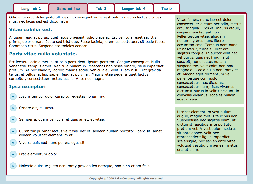 Convert the mockup below to functional XHTML and CSS. Submit two files, one for the XHTML and one for the CSS. Here is the style guide for the page: color for all the borders: #940627 main page background color: #c0dae4 right sidebar background color: #c8e4c0 highlighted tab background color: #e4c0c9 tab and header text color: #066e94 footer background color: #eff5f8 footer text color: #666666 main text font family: Verdana tab font family: Comic Sans Here is the checkmark image: Notes: - Ideally, your solution should work well in IE6, IE7, and Firefox. - The HTML should be cleanly written and easy to modify and adapt. For example, it should be easy for software developers to find the places that they might need to modify, should the HTML be hooked into a templating system such as JSP. Also, adding or deleting text should not cause the layout to break. - You don't have to get the spacing pixel perfect, but we do want it to be close to the mockup. Same goes for the font sizes. - The page content should be centered and fixed width so that it looks good on a 1280x1024 monitor. - The text in the mockup doesn't matter, so you can use your own random text if you like. A good way to generate random text content is using the Lorem Ipsum Generator at http://lorem-ipsum.perbang.dk/ - The header tabs and the "Fake Company" in the footer should all be links; it's OK for them to link to "#". - The rounded edges and corners are desired, but optional. Consider them extra credit. Here is the mockup: