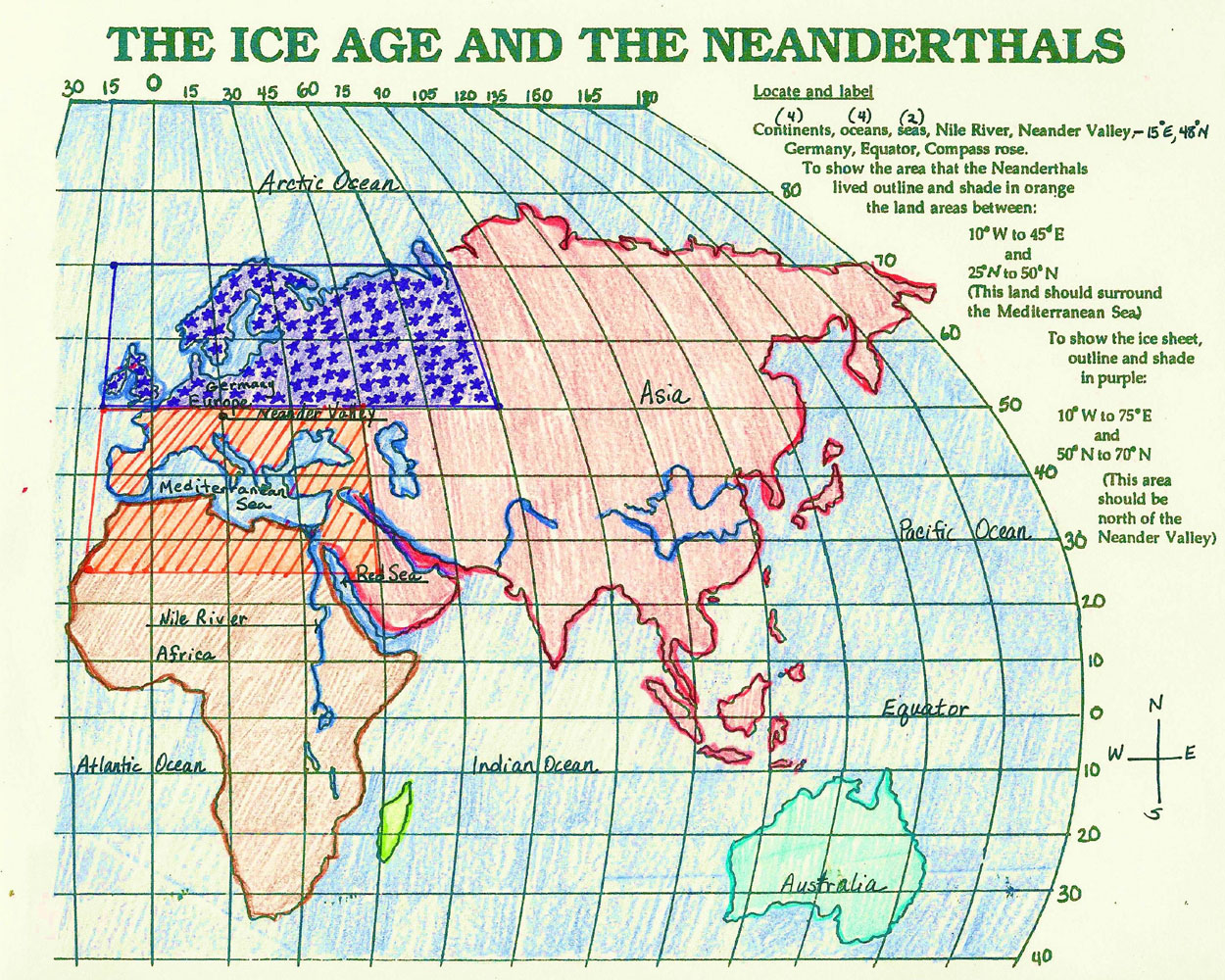 Read and study the following passage about Neanderthals. Then go to the Quia game links and play first the vocabulary game then the review game. Take the Quia Quiz. When you have successfully answered all the questions in the games and quiz, you will enter the Inspiration site and study the outline for Neanderthals. The outline will become your "notes" for the final test. As we progress through this unit, you will complete more and more of the Inspiration outlines yourselves. NEANDERTHAL As in the past the climate continued to alter. The Ice Age arrived. A new species of hominid appeared, better able to withstand the bitter cold. This species was called Homo Sapiens or Neanderthal. Homo means man. Sapiens means wise. They were also called Neanderthal because the first Homo Sapiens remains were discovered in the Neander Valley of Germany. They inhabited many parts of Europe and Asia. They adapted to the extreme cold and life on the tundras, or frozen plains.