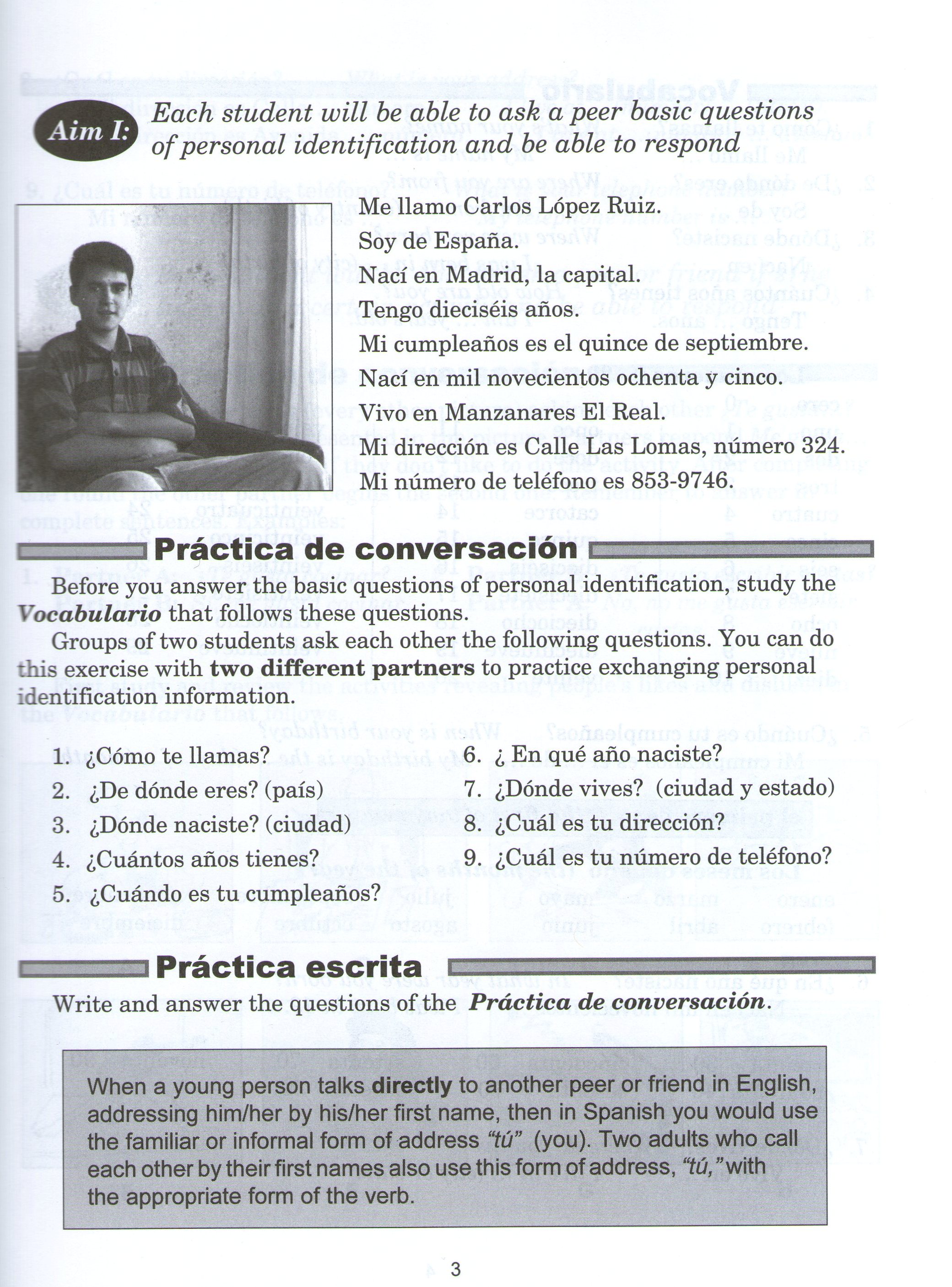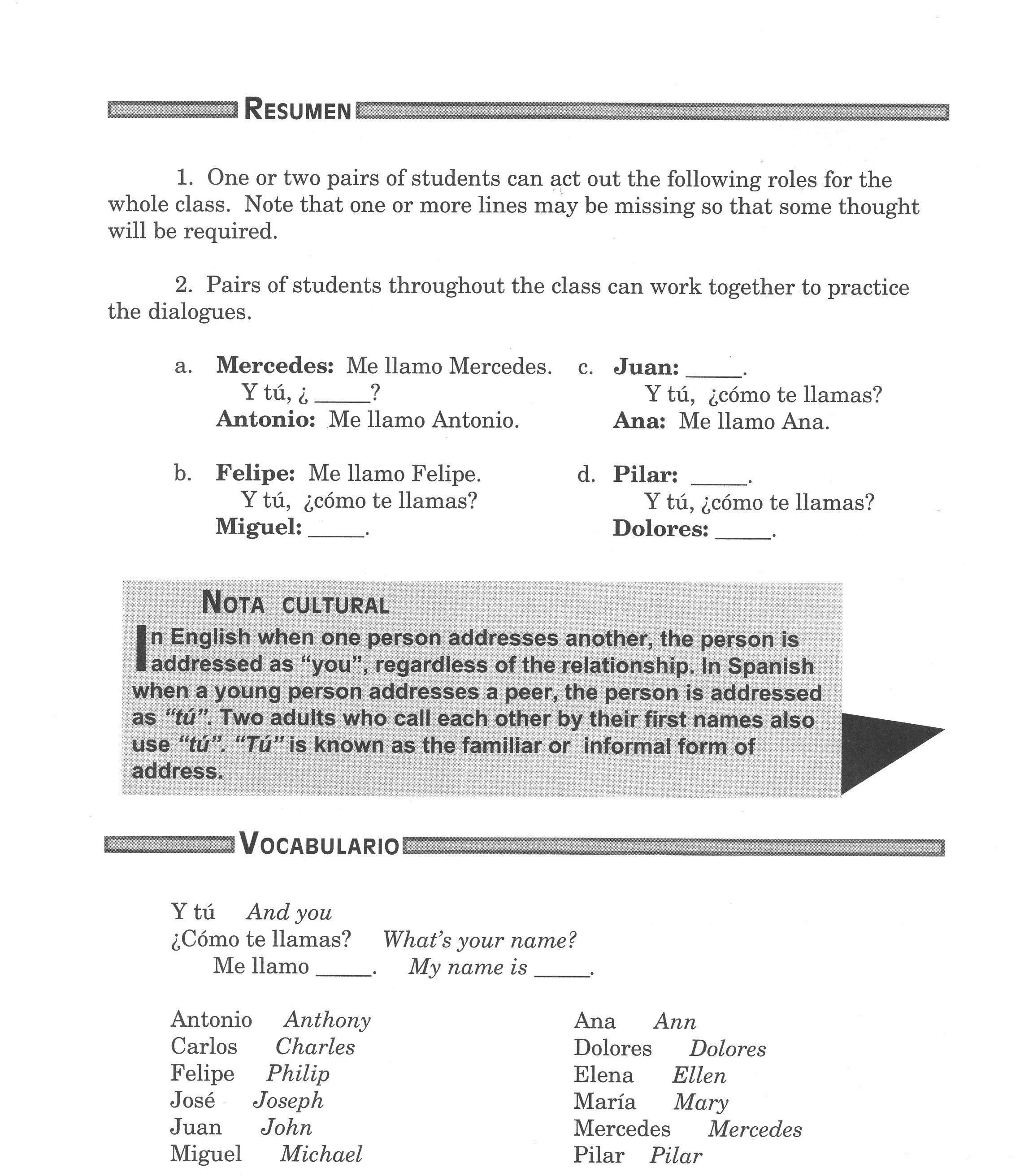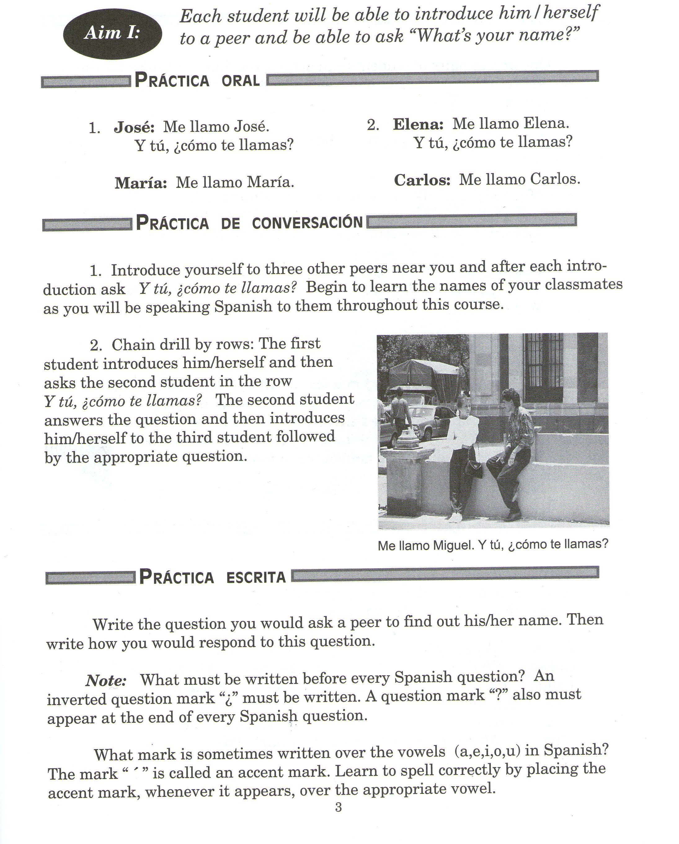 I. Warm-up: Students will rate themselves as beginner (1), intermediate (2) or advanced (3) based on their prior knowledge / experience with the Spanish language. They will also complete ''Práctica Oral (#'s 1 and 2) with a partner.
