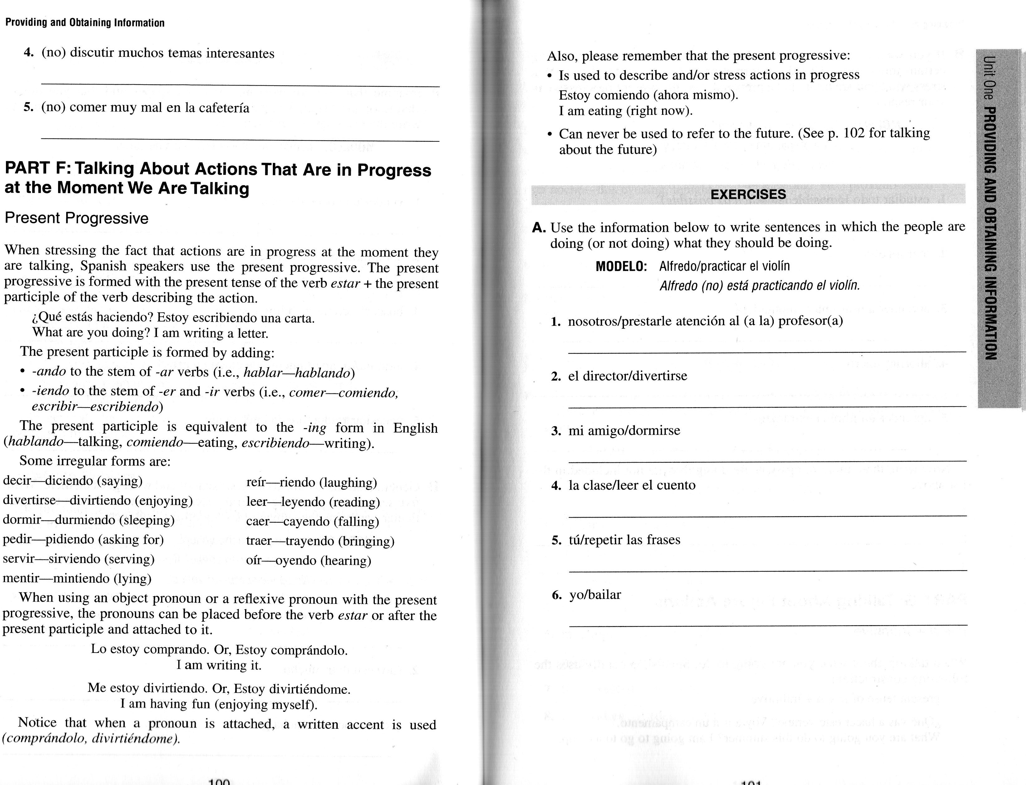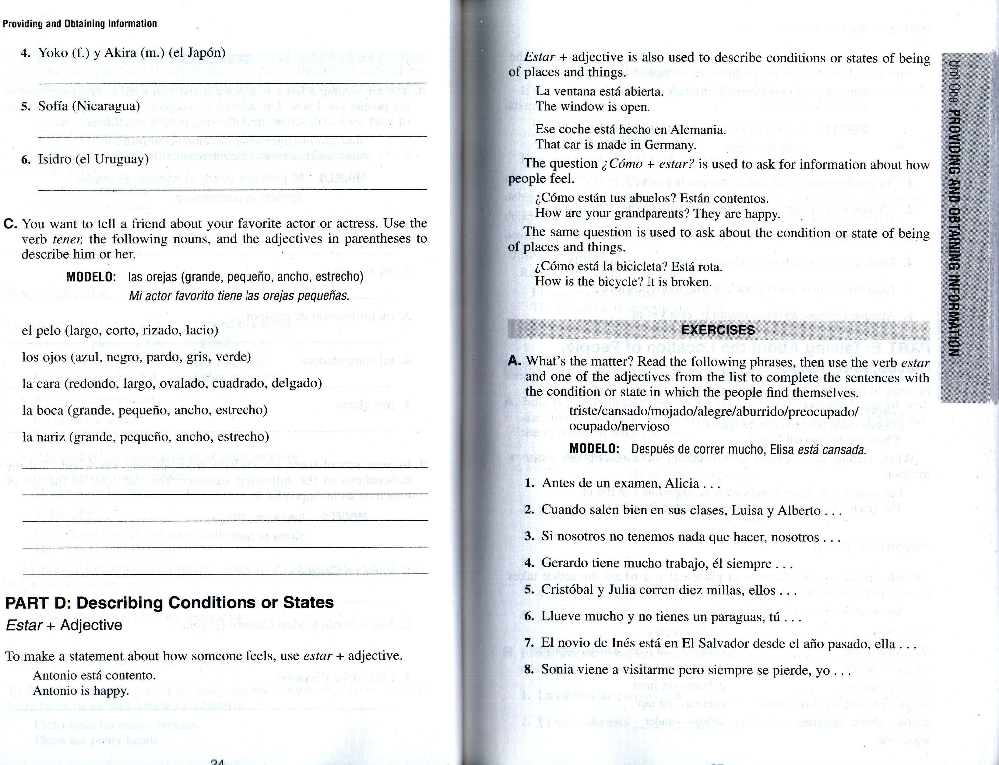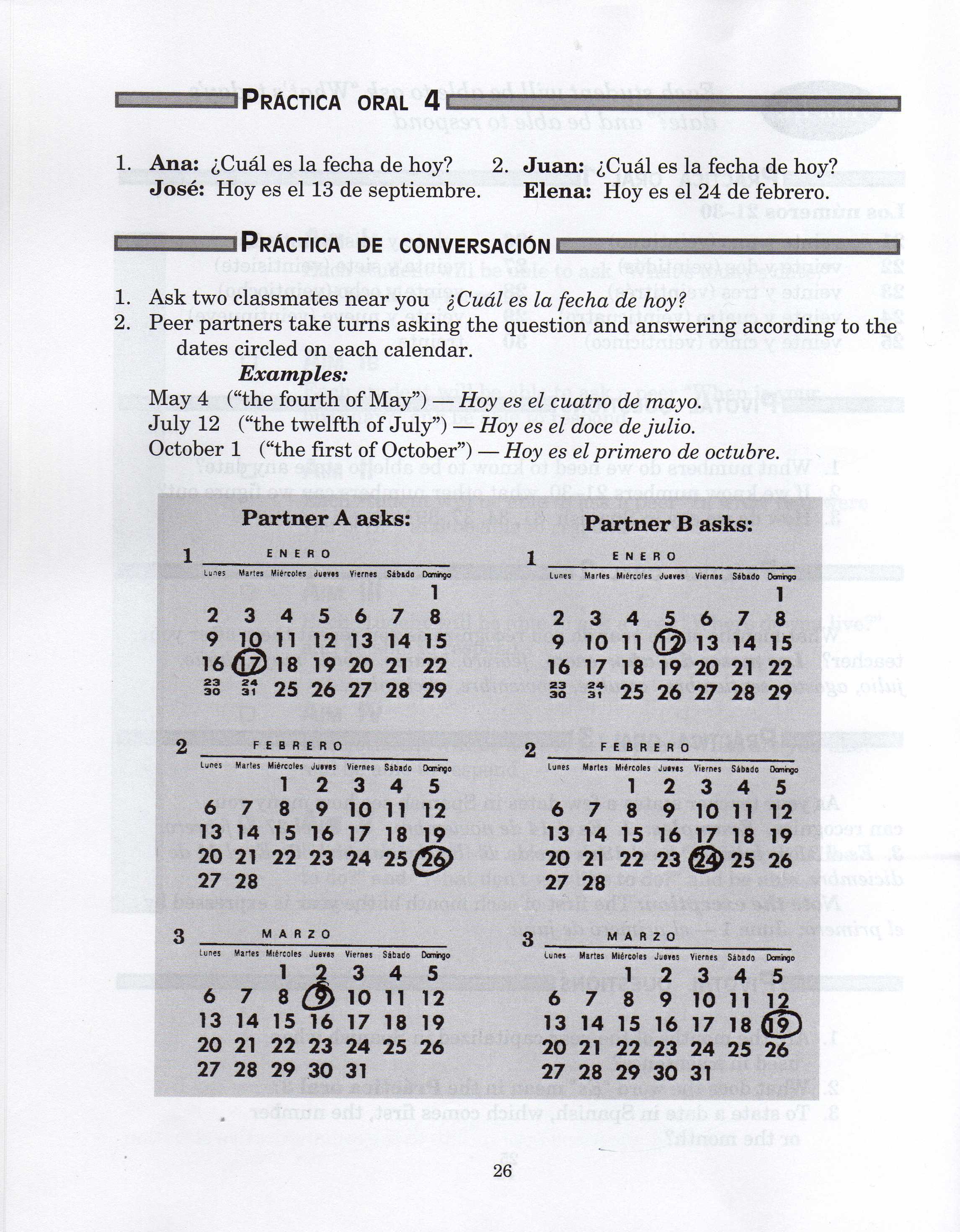 I. Warm-up: Students will rate themselves as beginner (1), intermediate (2) or advanced (3) based on their prior knowledge / experience with the Spanish language. They will also complete ''Práctica Oral (#'s 1 and 2) with a partner.