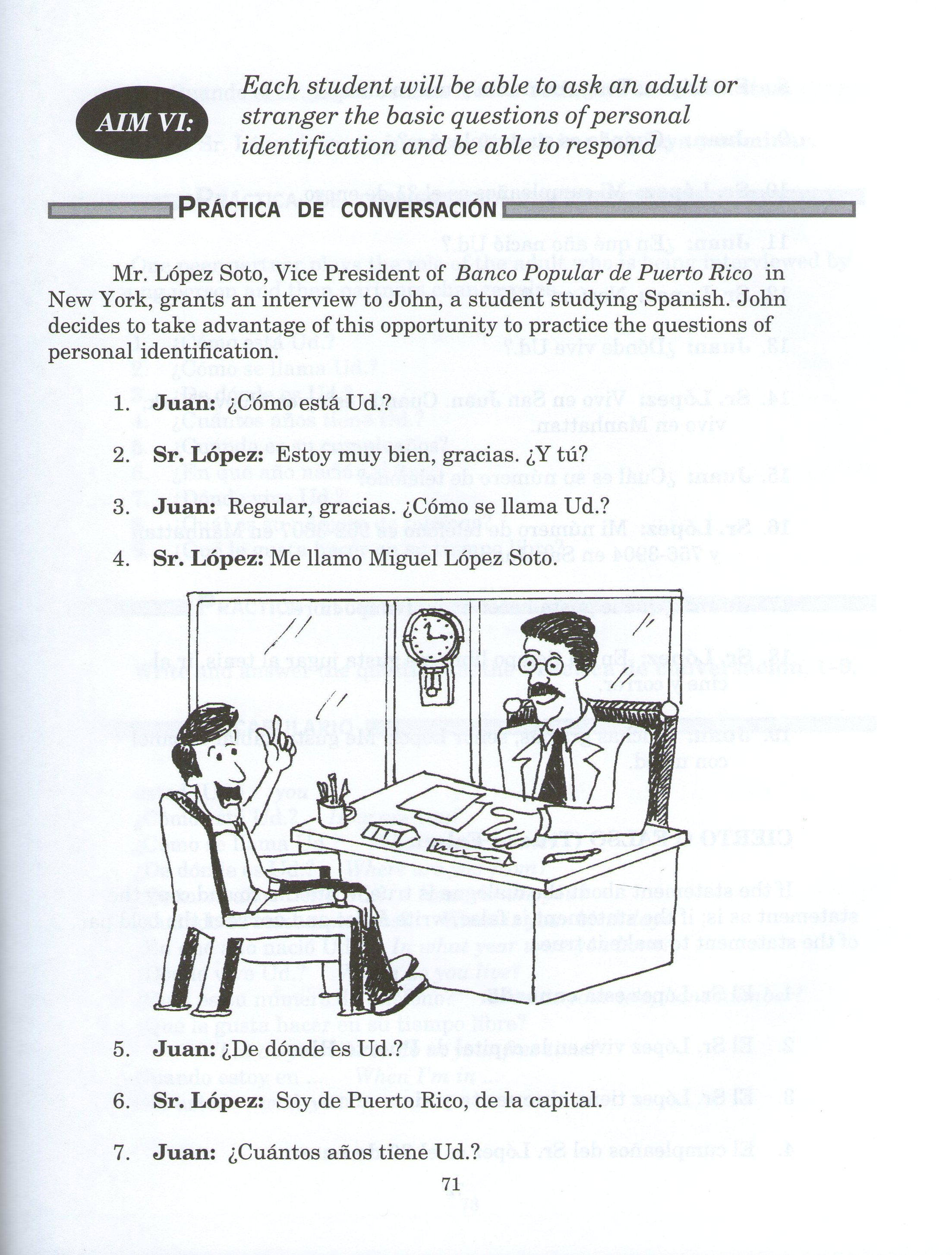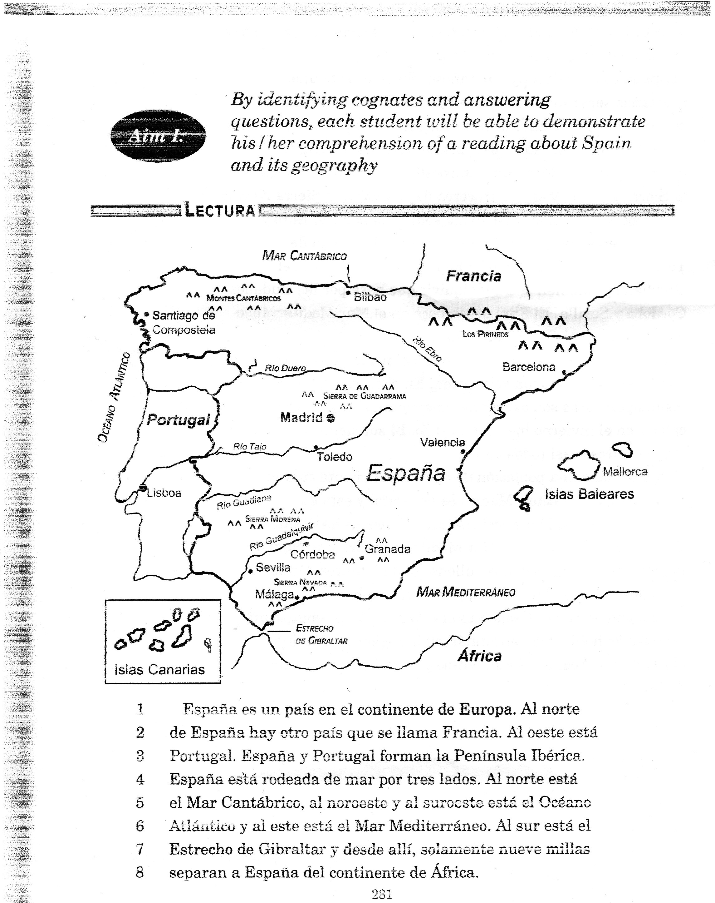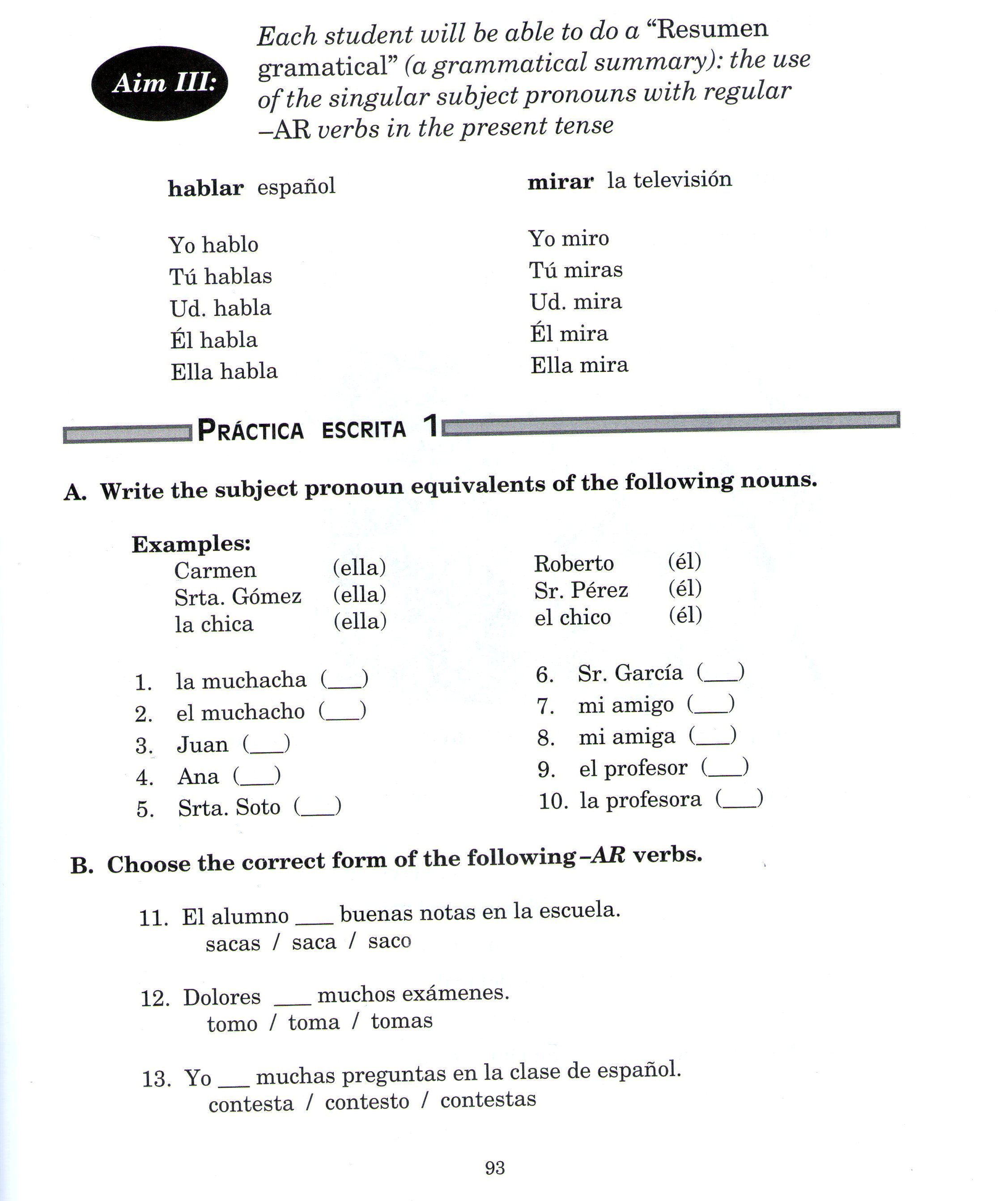 b.) Grammar: -Referring to contextual vocabulary with direct and indirect object pronouns; -Connecting subject to pronouns according to gender; -Connecting basic verbs and school related activities; -Addressing people appropriately (Formal vs Familiar); Conjugating -AR verbs; -Applying interrogatives appropriately; -Reading comprehension
