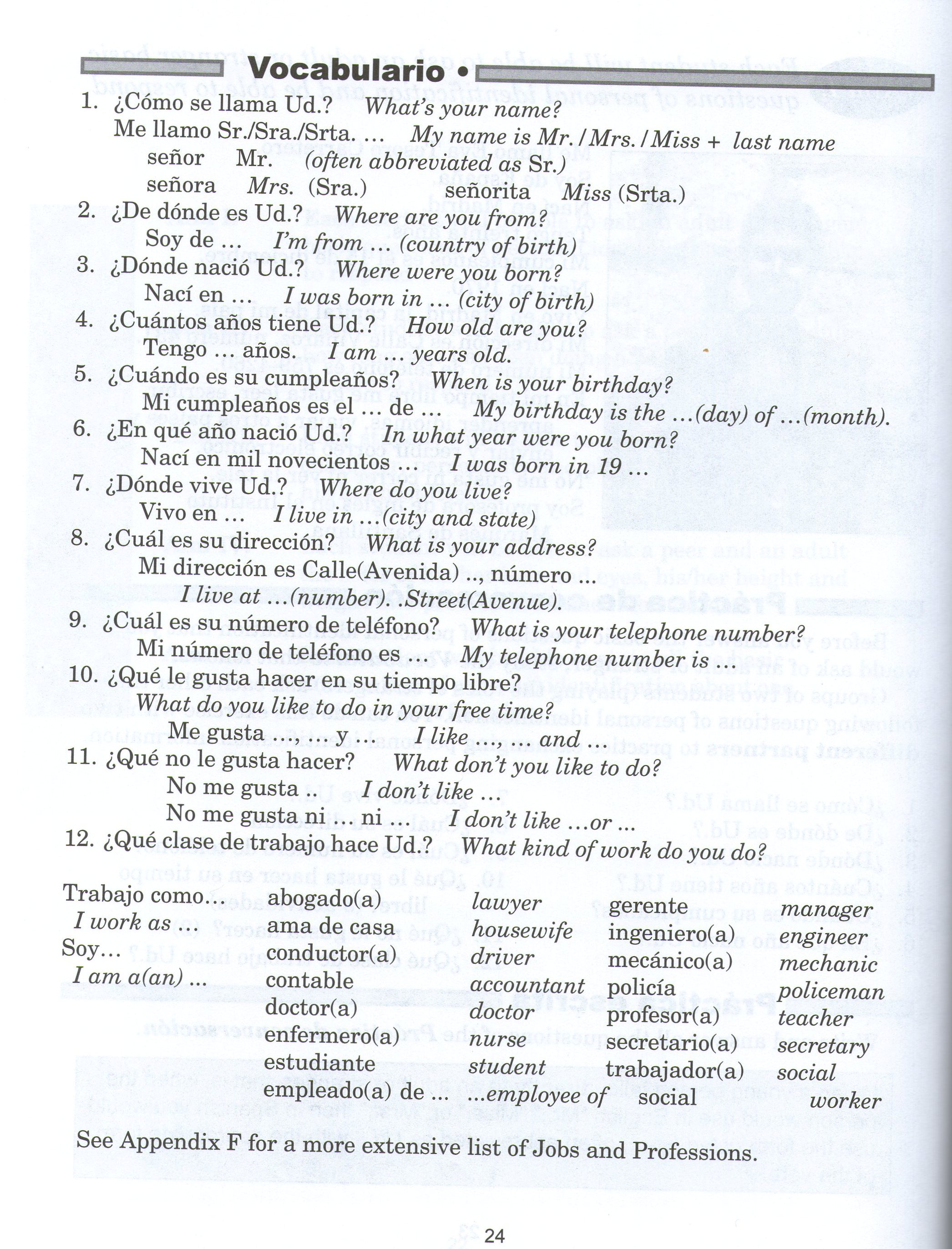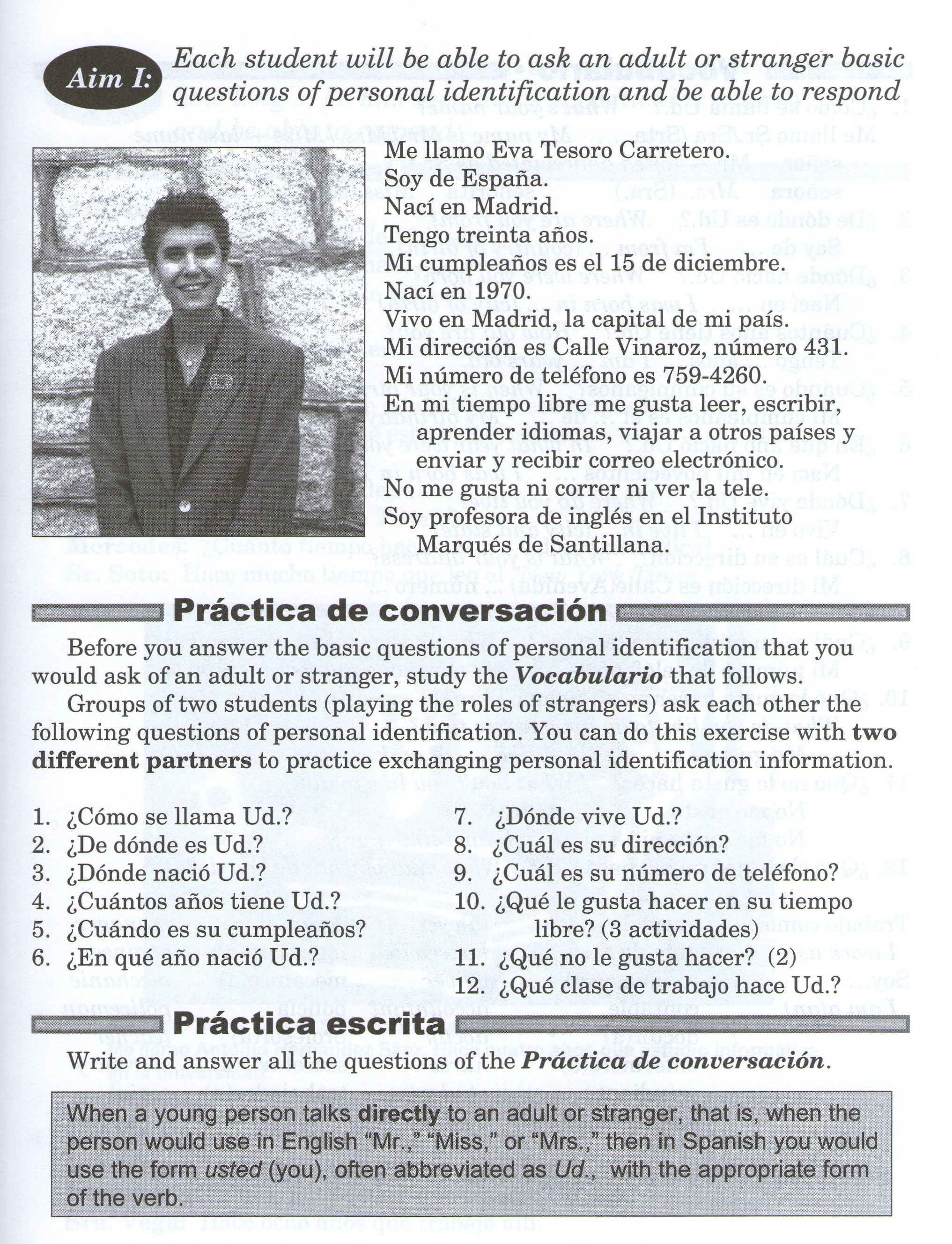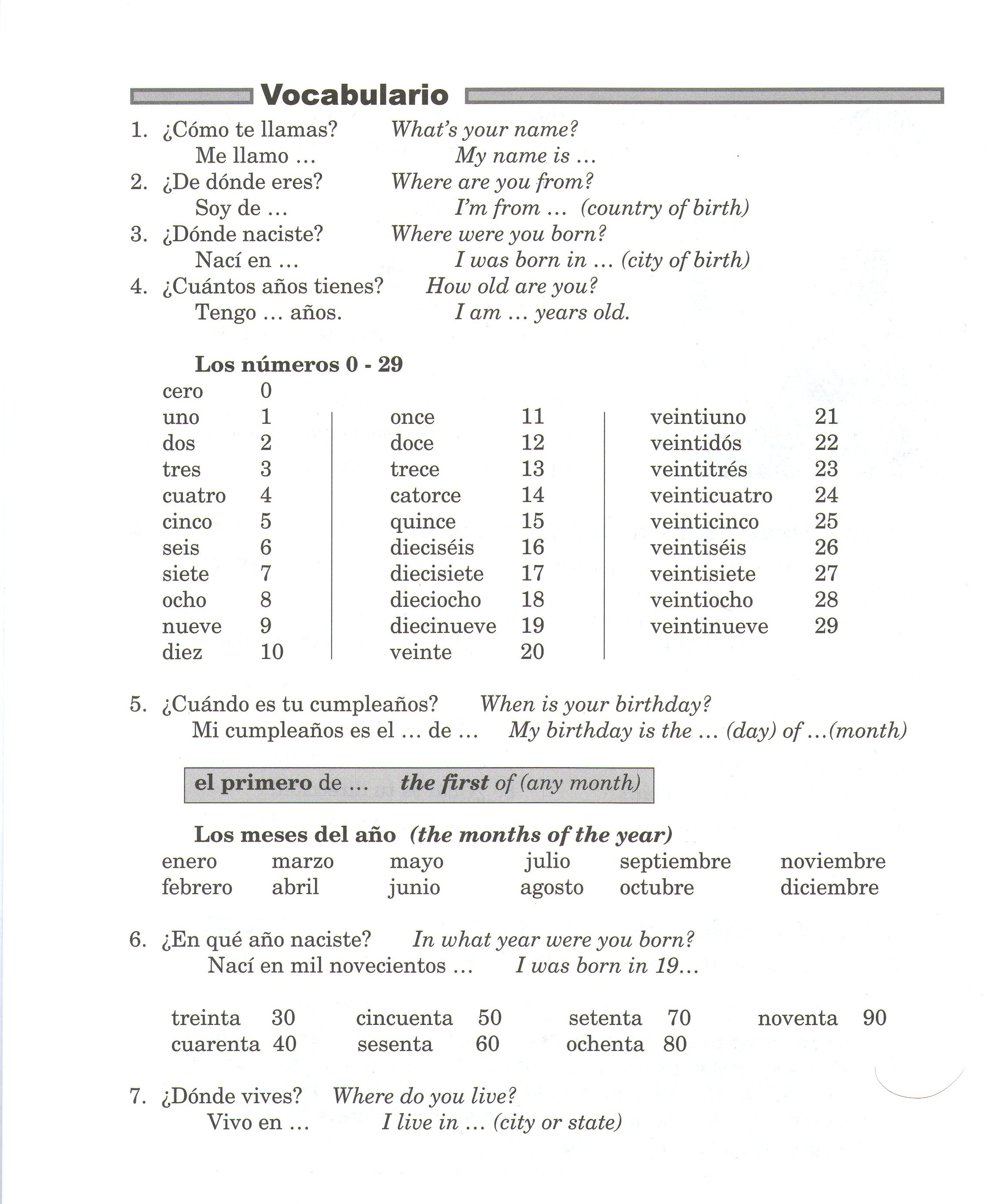 I. Warm-up: Students take turns asking / answering some basic questions for personal identification and record their responses. ex: ¿Cómo te llamas? ---> Me llamo Ricardo, ¿y tú? ex: ¿De dónde eres? Yo soy de Nueva York, ¿y tú? etc.