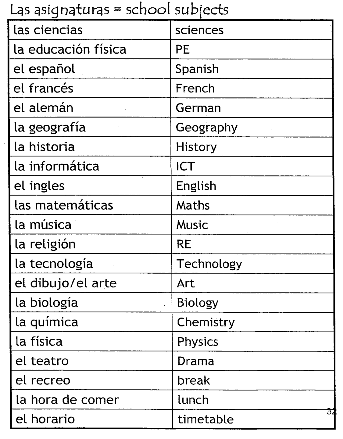 c.) Vocabulary: -School Subjects (Las asignaturas); -Time expressions