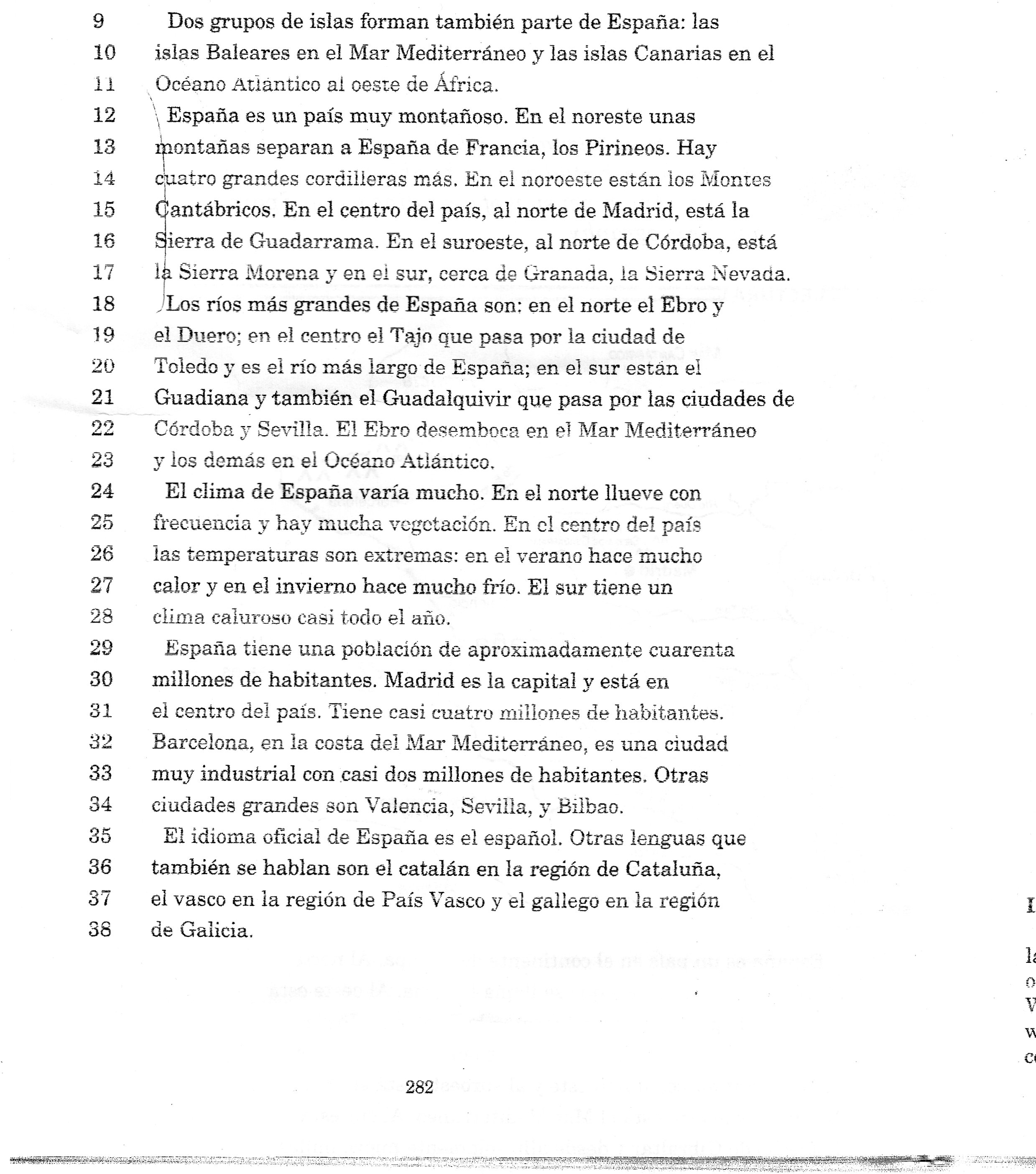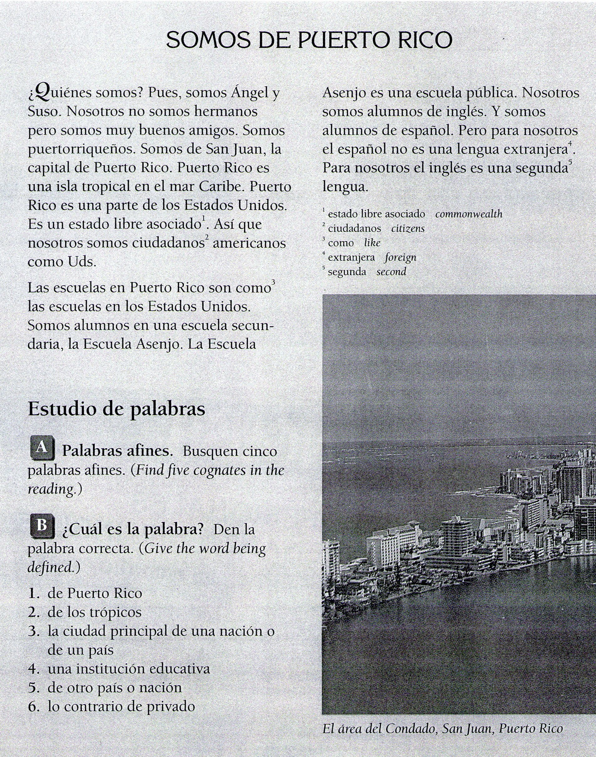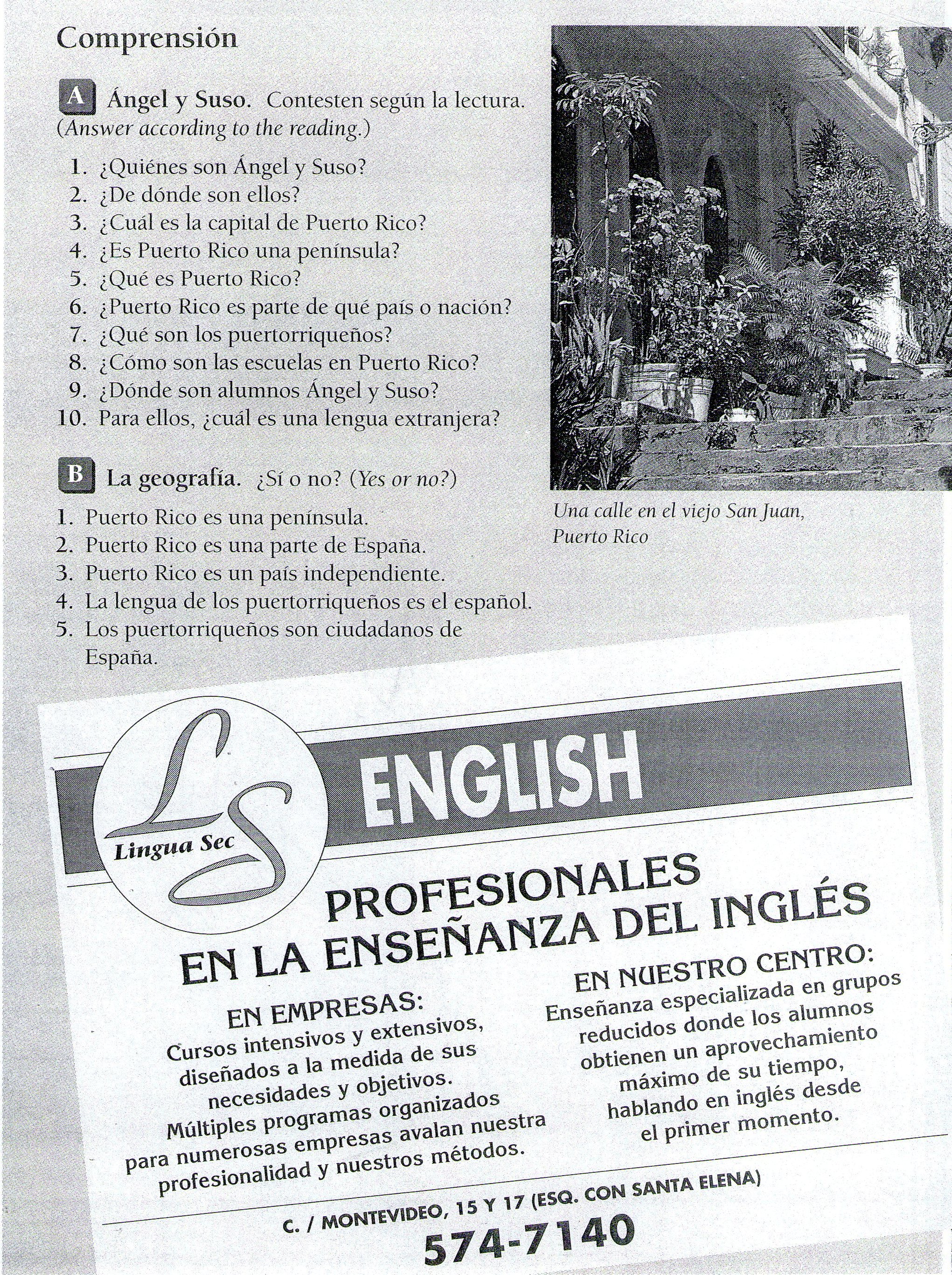 1(B): ¿De dónde son los alumnos? ¿Por qué no estudian el español Roberto, Juan y María? ¿Cómo hablan el español los tres muchachos? ¿De qué habla la profesora? Think about how questions are phrased in Spanish. Where are the prepositions (of, from, for, at, etc.) located? Where is the subject usually placed? How does this affect your understanding of the question?