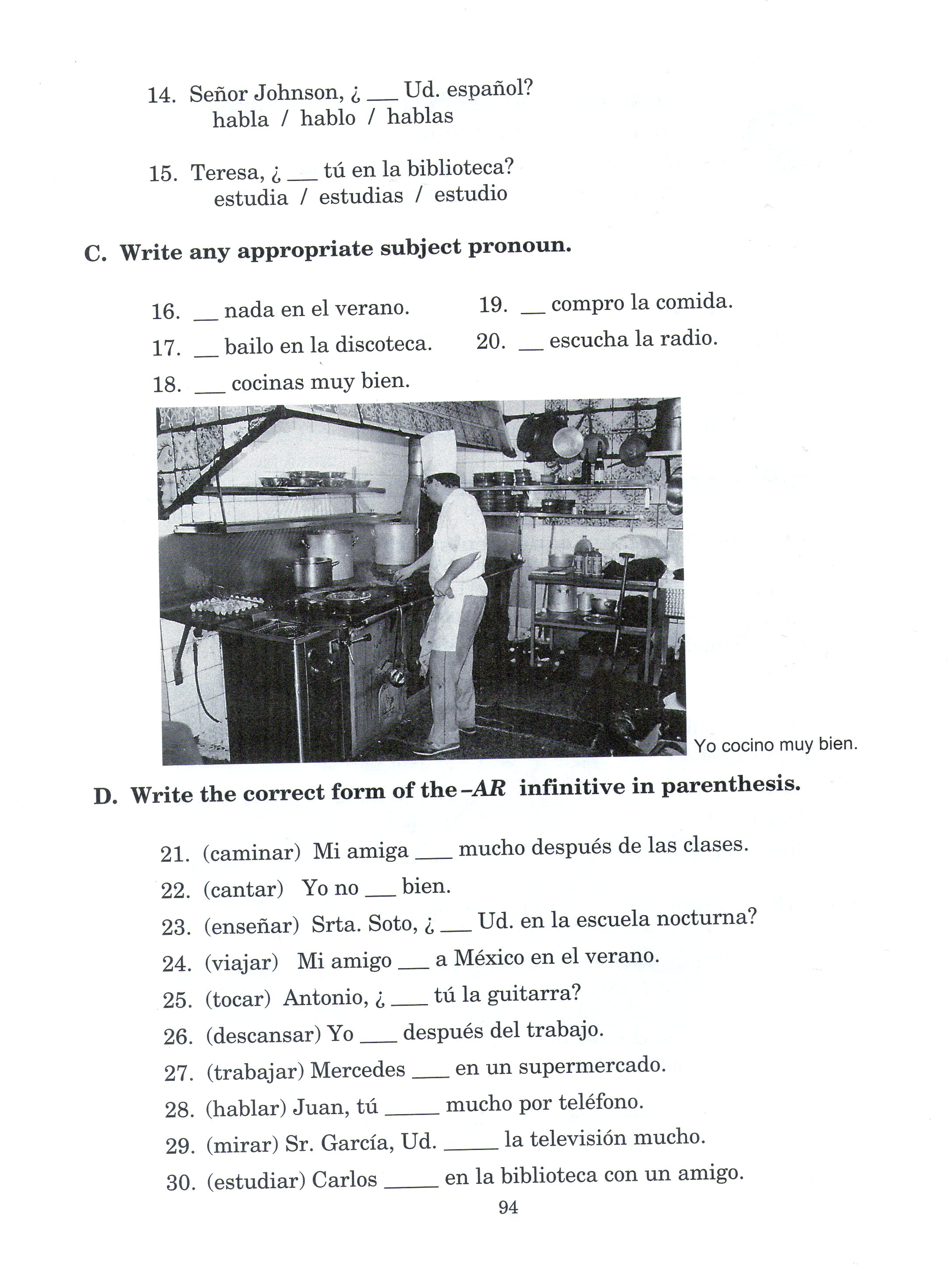 c.) Vocabulary: Hablar, Estudiar, Bailar, Usar, Necesitar, Montar, Dibujar, Patinar, Caminar, Cantar, Sacar, Prestar, Contestar, Llevar, Dar, Enseñar