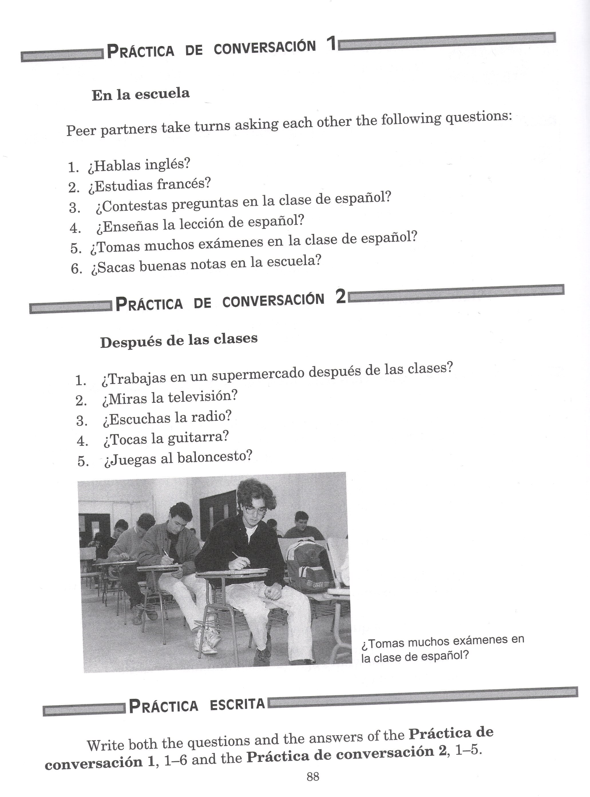 V. Warm-up (part b): Peer partners take turns asking and answering questions from "En la Escuela" and listen closely to their partner's responses.