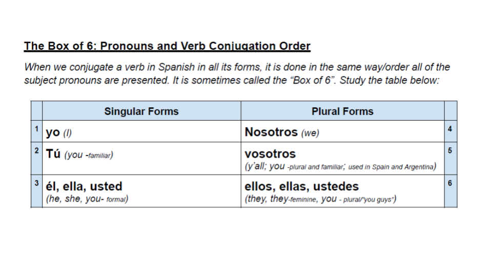 Put these conjugations in the following order - yo, tú, él, nosotros, vosotros, ellos Click here to review the conjugation order.