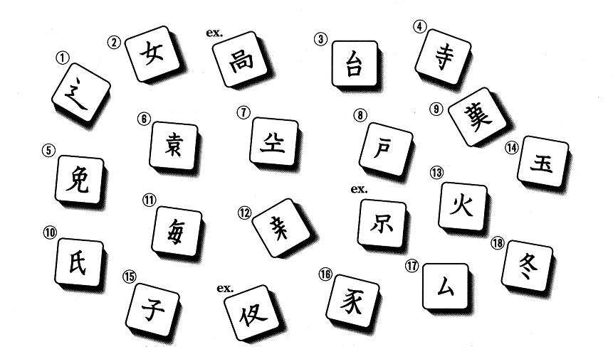 Combine the radicals pictured with the questions with the components below to form eighteen (18) kanji characters.