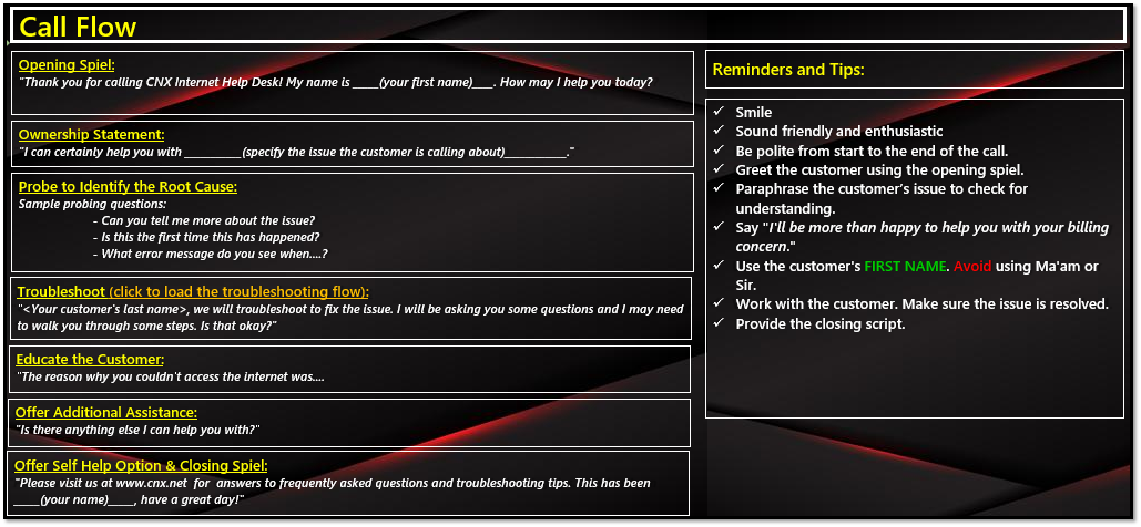 PLEASE READ •You will use this tool as you go through the role play session. •You will play the role of a techinical support representative. •You will be given 10 minutes to be familiar with the call flow, troubleshooting steps and other importat information about the product. •If you have questions, do not hesitate to ask your facilitator before the role play begins