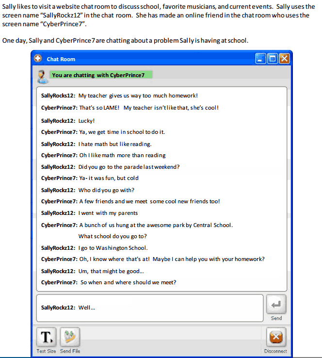You will read an online chat between two people who have never met in-person. You will think about and respond to the conversation and answer some questions. You can use either complete sentences or short answers. Read the task below, including all of the text in the “Chat Room” box. Then, answer questions 1 through 6.