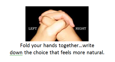 - Fold your hands together and now look at your hands. Is your left thumb on top or right thumb on top? Now put the other thumb on top...which one feels more natural?